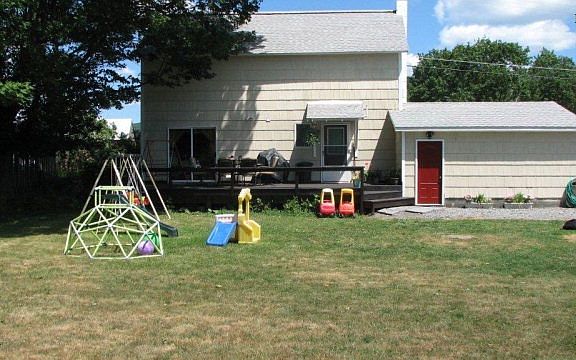 Summers Coming! Be ready for the barbecues on this huge deck over looking a private back yard stocked with mouth watering fruit trees, vegetable and flower gardens. 3 bedrooms updated kitchen with breakfast bar. New bathroom. Fresh interior paint. 5 yr. old roof & hot water heater. House is fully insulated. 1 car attached garage with separate furnace. Plus a over-sized 2 car garage with dry walled rooms, 200 amp electric service & plumbed for a bathroom. No worries about parking because there is enough room to park a RV and several cars. TCAT stops right at your front door!