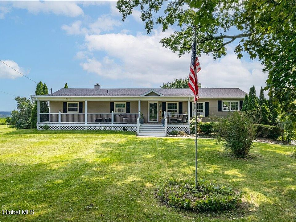 Amazing, Spacious 4 Bed/2 Bath Ranch with over 3,000 sq.ft. of living space with the finished basement, sitting on 1.40+/- acres, with walk out 2 car garage, in-ground pool, large yard with an area fenced in, storage sheds & large front & back covered porches/decks! There is an invisible dog fence & collars available too! Annual taxes are $4,570+/- with NO exemptions! 1st Floor:Large dining room with a pellet stove, living room, kitchen, back door entry/large room, 2 full baths (off the primary & main hallway), 4 bedrooms (1 used now for laundry room). 4 Finished Rooms & Pellet Stove in Basement. Siding, Windows, Roof all replaced in last 5 years! Water treatment system NEW & included. Outdoor Wood Boiler included as well. Pool Pump New in 2023. Seller to give a credit for New Pool Liner.