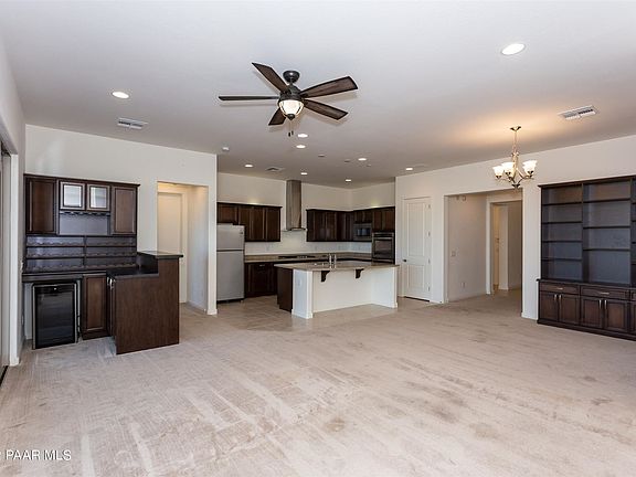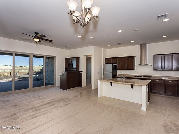 Highly upgraded with beautiful panoramic views and the lowest price in popular Granite Dells Estates. Sliding glass doors in great room open to large covered patio with expansive views. Two bedrooms (each with private bath) plus den. Granite counters, breakfast bar, 5 burner gas cooktop plus double wall oven in kitchen. Custom-made built-ins include a wine bar with refrigerator, plus cabinets in the dining room, den, laundry room and garage. Backyard has a fire pit and water feature, plus panoramic views which include Granite Mtn. Extensive use of pavers in the landscaping. One large covered patio off the great room, plus another off the dining room. 2.5 car garage has room for a workshop, storage, etc. New roof and gutters in 2021 due to hail damage. Refrigerator, washer and dryer stay