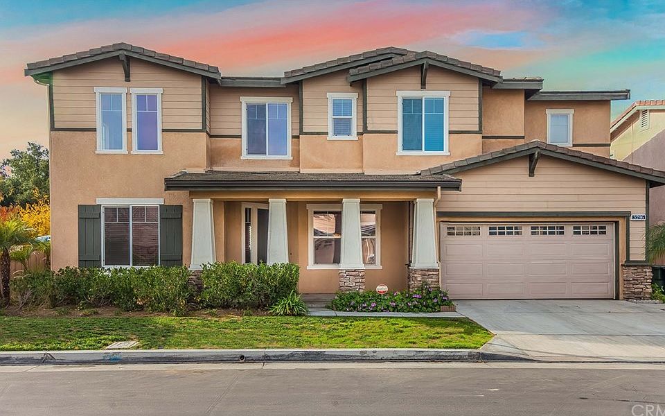 Stylish home on a peaceful cul-de-sac located conveniently close to shopping, restaurants, and freeways. Beautiful curb appeal with a covered front porch, stacked stone, and shutters. The tiled entry leads to the bright living room featuring laminate wood flooring and vaulted ceiling. Formal dining room offers laminate wood floors and crown molding with a walk-through pantry that leads to the kitchen. Updated kitchen features granite counters, ceramic tile flooring, crown molding and a center island with an additional eating area and sliding glass doors to the back patio. The family room highlights a fireplace and large windows looking out to the backyard. Spacious upstairs loft overlooks the living room and can be used as a bonus room or could be converted into a 4th bedroom. Master bedroom features crown molding and a full master bathroom with a dual-sink vanity, separate tub and shower, and walk-in closet. Two additional upstairs bedrooms with a full hall bathroom, and a half bathroom located downstairs. The home backs up to a nature trail, offering a nice private backyard with a covered patio that overlooks the surrounding greenery. Two car attached garage.