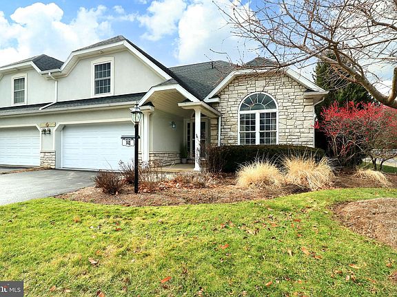 Luxury duplex built by Sunrise Homes in the desirable Cobble Creek neighborhood! Enjoy mostly one floor living with a bonus bedroom and full bath on the second floor. Enter into a welcoming foyer featuring tile flooring and a tray ceiling with crown molding. With French doors the spacious office with its vaulted ceiling, skylights, and palladium window is also perfect for a library, music room, or den. With an open floorplan and expansive wood flooring you'll enjoy the copious sized great room with its cathedral ceiling and a gas fireplace, the attached sunroom with patio access, and the adjacent dining room with a large window, archway, tray ceiling with crown molding, and accent lighting. The kitchen features a breakfast bar, solid surface countertops, maple cabinetry, tiled backsplash, undercabinet lighting, and a pantry. Retreat to the oversized owner's suite with sitting area, walk-in closet, and an owner's bath boasting a tiled shower, jetted tub, and dual sink vanity. Upstairs you fill a large guest bedroom with a walk-in closet and full bath. Enjoy sitting on your front porch or back patio, or head over to the clubhouse to get social in the gathering room or gym. Other features include main floor laundry, gas heat and central air, radon mitigation, a two car garage, a security system, and second floor storage/mechanical room. A quiet location that's very close to bike paths and parks, yet not far from downtown State College and Penn State's campus. Lots to love!