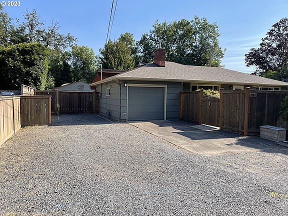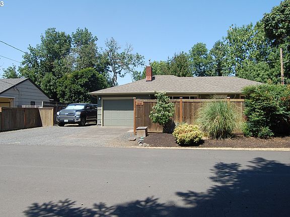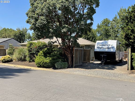 Updated and maintained impeccably, and move-in ready!! Functions like a larger home. The hardwood floors and gas fireplace add touches of warmth. You will enjoy cooking in the stylishly remodeled kitchen with quartz counters, stainless steel appliances, pantry cabinet, and view of the garden that has raised beds, strawberries & blueberries, espaliered apples with 4 varieties, and full irrigation. The bathroom has been completely remodeled and offers a contemporary barn door entrance, dual shower heads, cultured marble shower surround and counter, updated lighting, and tile floors. Laundry area includes stackable washer/dryer and the addition of a laundry sink. One of the highlights of the home is a stunning covered deck that creates a pleasant outdoor room for year-round use. Beautiful wood built-ins and new bay window are featured in the dining area. Additional amenities include: newer exterior paint and hot tub, vinyl windows, RV parking with all hookups, 20x20 heated, detached garage/shop, forced air gas furnace and central A/C, roof replaced approx. 2010, motion sensor exterior lights, and private front patio. This is a rare find of a property that has a gorgeous interior, driveway space for numerous vehicles, 2 gated parking areas for RV and other toys, ample storage, light and bright, heated shop with potential for hobbies, dedicated home office for remote work, gym, art studio, and neatly landscaped areas for gardening and for play. This property is also fully fenced. All of this on a corner lot with potential for future expansion or ADU. Location convenient to Oakway Mall, eateries, Autzen Stadium, Gateway Mall, hospital, and freeway access.