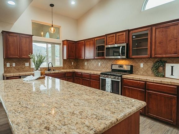 • Kitchen Island, High Ceilings, Ceiling Fan(s), Granite Counters, Open Floorplan, Recessed Lighting, Tile Counters, Kitchen Open to Family Room, Remodeled