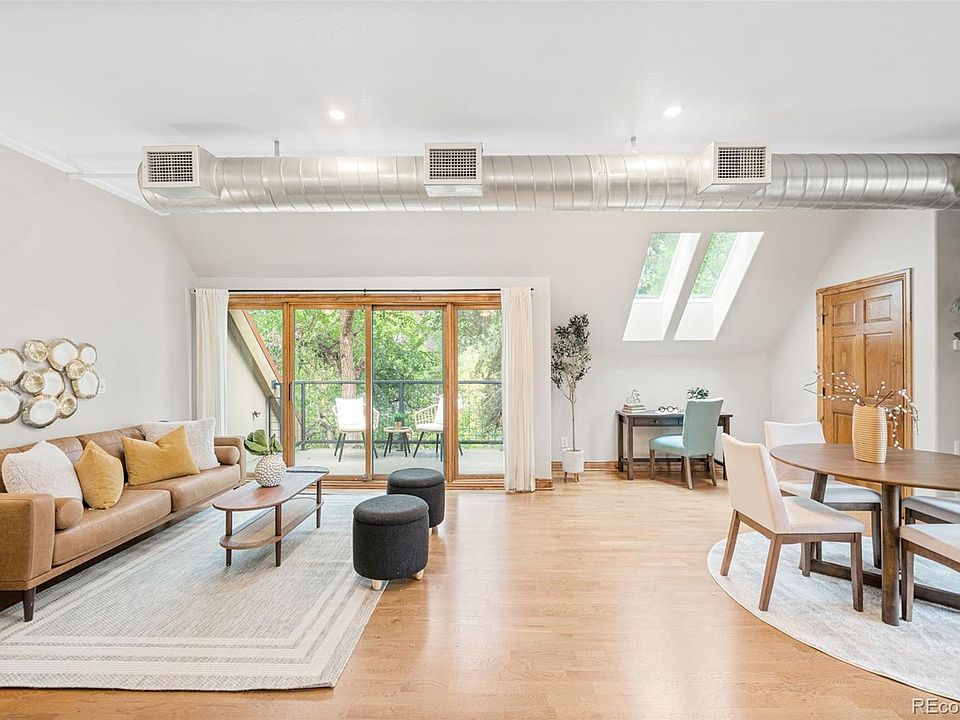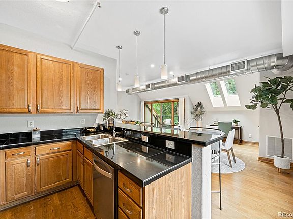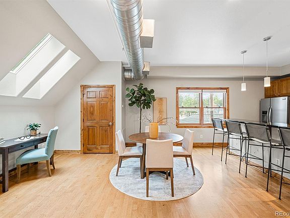 Bright and airy with high ceilings and skylights, this stunning 1-bedroom, 1-bathroom residence is just steps from some of Denver's best bars, restaurants, and shops at Highlands Square. The open floor plan of this residence features warm wood floors throughout and incredible natural light from the plentiful windows and skylights. The well-appointed kitchen boasts a large breakfast bar, perfect for entertaining, and seamlessly flows into the well-appointed dining area and expansive light-filled living room. Step through the sliding glass doors onto a generous private balcony - ideal for enjoying your morning coffee, afternoon cocktails, bbq grill, or the perfect home for your flower and herb garden. The primary bedroom is generously sized with ample closet space, while the full bathroom is a retreat with double sinks and a skylight that bathes the space in natural light. Additional conveniences include an in-unit washer and dryer, a dedicated HVAC system, and a newer hot water heater. The building offers secure entry, a quick elevator, and this residence comes with one dedicated garage parking space and secure storage locker. The real highlight is the unbeatable location—just steps from Highland Square. In just seconds you can walk to the best restaurants, ice cream shops, energizing workout classes, pop into a wine shop or check out the latest fashions. Furthermore, you'll be positioned a quick bike ride to Sloan's Lake, LoHi, or downtown Denver. You won't want to miss this dreamy urban oasis - schedule your private viewing today.