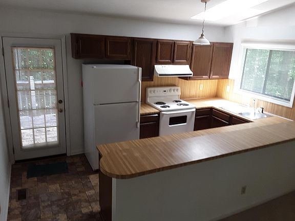 Duplex on wooded lot, great room, cathedral ceiling, woodburning fireplace. Large kitchen, lots of counter and cabinet space. Ceiling fans and sky lights create an airy environment. 2 bed rooms with 2 large closet each. Generous bath room with tub shower. New flooring throughout. Newly painted. Wide front porch, and very private back deck overlooking the woods. Convenient to shopping and 5 min. to UNC Owner pays for water.Non smoking