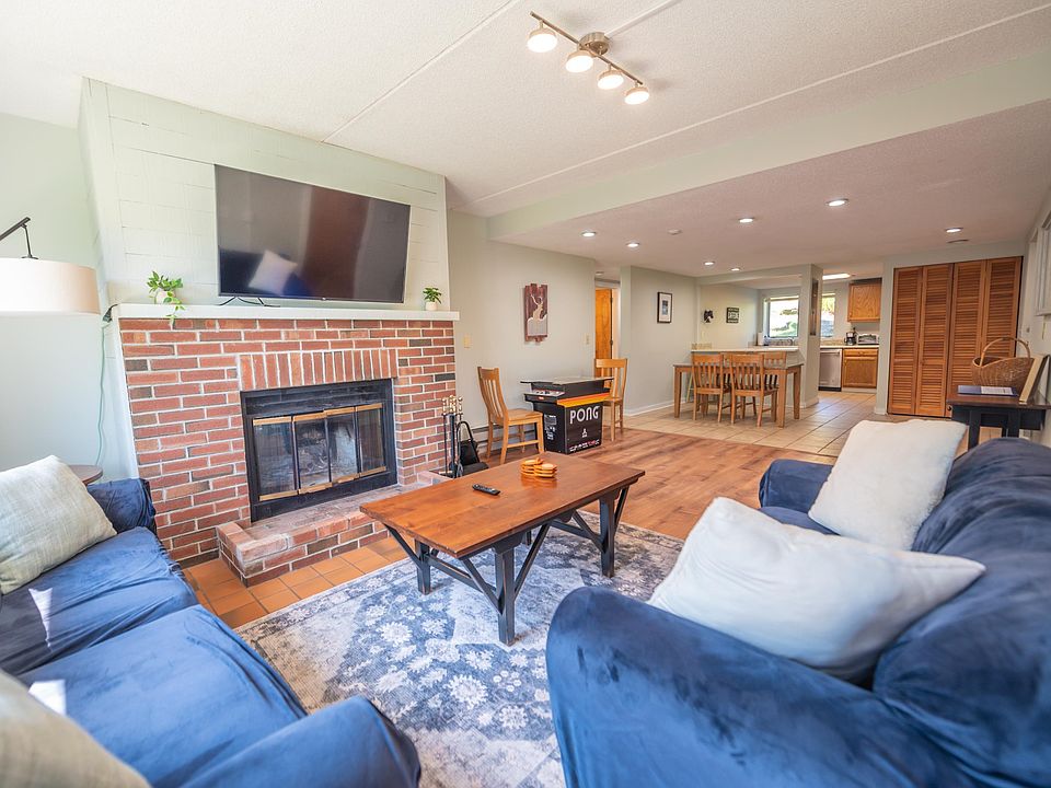 This nicely updated two bedroom, two bath Snowtree unit is located at the base of the Mount Snow ski resort. There is shuttle service to and from the mountain, easy access by way of a foot bridge through the community, and the unit looks west with views of gorgeous sunsets, down the valley, and winter views of the slopes of the mountain, so that you can check the conditions from your window in the morning, and watch the fireworks from your living room at night. This open concept condo features tremendous natural light throughout, a large living space with wood burning fireplace, brick hearth, kitchen with breakfast bar, primary suite with direct views, guest suite with full bath and plenty of room for overflow sleeping, a dining area, tiled mudroom entry, laundry room, owner lockable closet, and covered deck overlooking the winter ski trail view. The unit also offers a ski locker in the building, club house with outdoor pool and indoor hot tub, building maintenance, snow removal, shuttle to and from the base area, and more. Thanks to on site management this condo affords plenty of downtime, not upkeep.