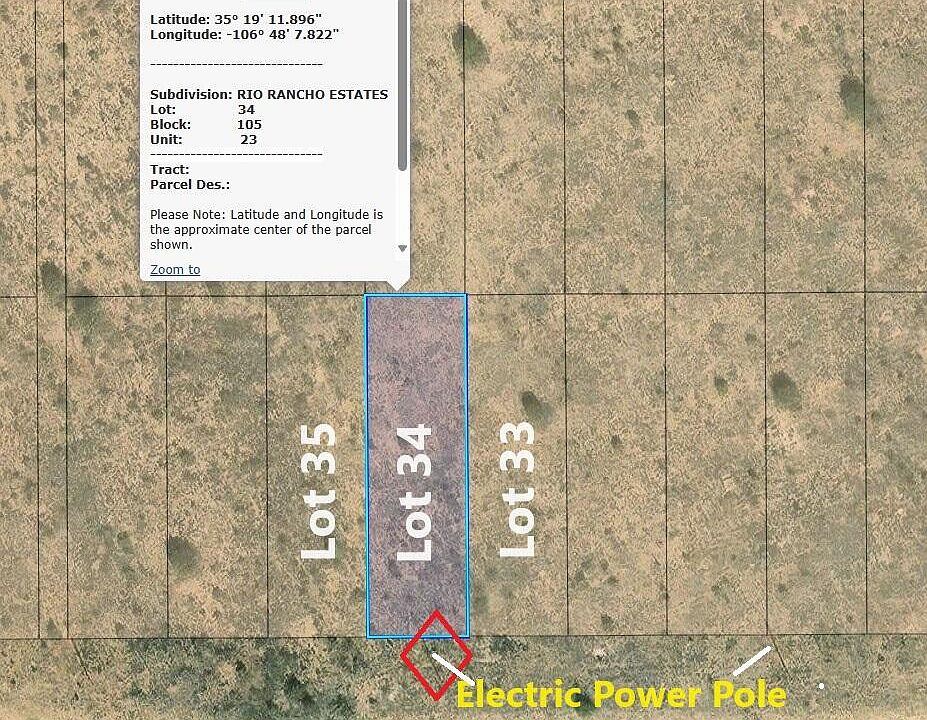 Se habla Espanol - Electric Power Pole with access on property with easy hook-up to power. One & 1/2 Acres /3 Lots together. Build your dream home or make this your investment property. Easy to buy easy to own. Call today. Cash only/ No owner financing.DIRECTIONS - FROM Nothern Meadows Subdivision go west on King Blvd to Lots.GPS Lot 34 Latitude: 35 19' 11.896'' Longitude: -106 48' 7.822''