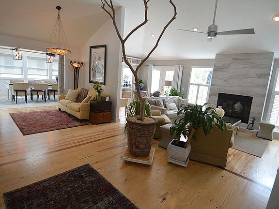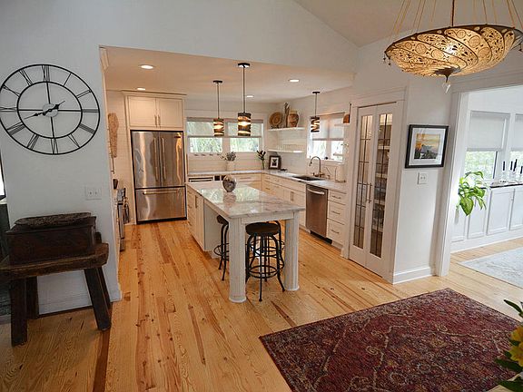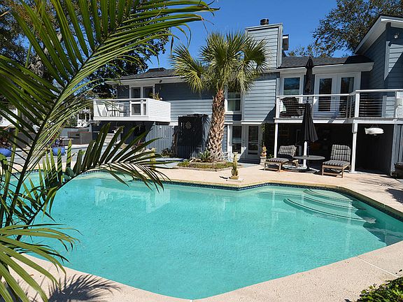 Walk into this meticulously renovated island home. The feel for this home is like no other. Comfortable classy open floor plan living. The heart pine floors are so warming you feel at home right away. The great room kitchen and dining room are free flowing and perfect for entertaining your guests or family. The high ceilings and skylights bring in so much beautiful natural light it instantly creates a happy feel. The kitchen has an extra long island perfect for the cook who likes to have company while getting the meal ready. The dining room is exquisite with ship lap to the ceiling and a skylight for more natural light. The great room has a tremendous fireplace right off the great room. The master bedroom in this home is stunning. The entire room has been redone to perfection. The bathroom has a fantastic oversized shower and tons of storage room. The closets are wonderful. California closets with tons of storage. No need for any dressers it's all built in. The bed frame is built into the wall with ship lap surrounding. Enjoy the sunning reading relaxing private deck off the master overlooking the pool. The other wing of this floor is the guest wing with two bedrooms two full baths and an office area. Now to the pool area. All I can say is amazing. The pool is a gunite-in ground pool. Tons of decking for ping pong darts lounging eating and entertaining. The lighted cabana bar is the perfect spot for gathering. The whole back yard is fenced in with mature landscaping and great privacy. Just around the corner don't forget to check out the screened in porch off the pool area for enjoying a round of golf or a tennis match on TV while you take a break from the pool. The two bedroom two bath apartment has direct access to the pool too and it's own driveway and entrance. The location can't be beat. If you have a boat the rentable docks are a block away the marina is two blocks recreation center is 10 blocks and the beach is two blocks away. This home is a perfect private residence second home or rental property. The options are wide open. Must see this one to really appreciate all it has to offer. Maintained and upgraded with love and you can feel it the minute you walk in.