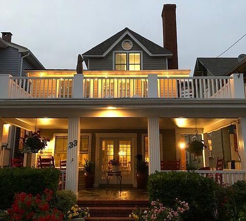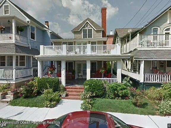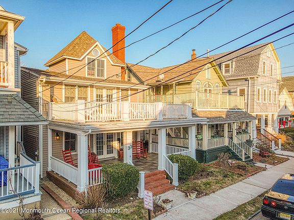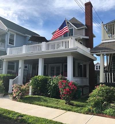 Great curb appeal! Large deep front porch with flagstone floor. Renovated kitchen and bathrooms. Three full bathrooms, three bedrooms, beautiful working fireplace and central air. Open floor plan to the dinning room to the kitchen with stainless appliances. Very large master bedroom with private bath and access to the large second floor balcony. Lots of closets, built in book shelves, hardwood floors throughout and large fiberglassed deck with ocean views. Block and one half from beach and boardwalk. Large back side porc