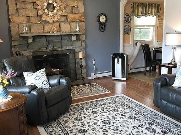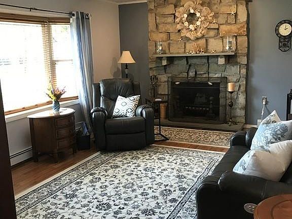 This home is situated on over a half acre with mature trees on a corner lot. Living room features a stone fireplace highlighted with indirect lighting. Kitchen has wooden ceiling, ship lap walls with French door leading to a private yard. Updated bathroom, windows, roof and furnace. Stainless steel appliances in Kit. stay along with washer and dryer. Possible expansion. Town water and sewer. Owner pays $450 yearly for flood insurance which is transferable.