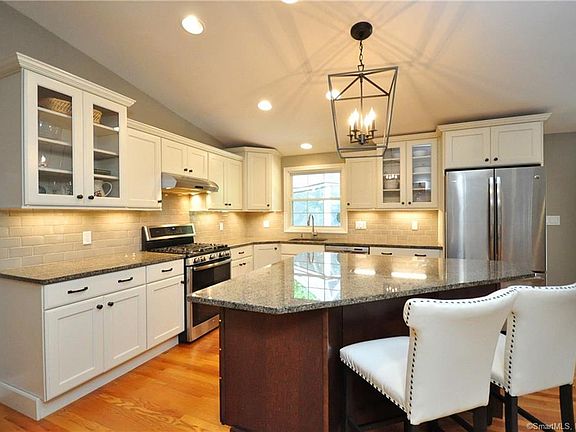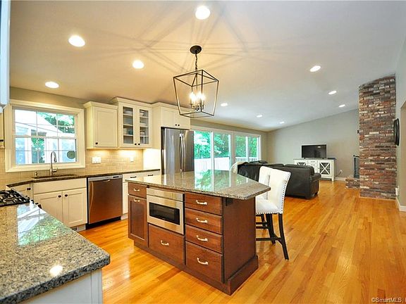 This spacious ranch near Simsbury center is a MUST SEE First floor living doesn't get better than this. Located on a Cul-de-sac near Hopmeadow Country Club, this home has the best of both worlds: a serene setting & the convenience of nearby amenities. The home's manicured landscape and immaculate curb appeal are evident as you pull into the circular drive. Inside you will find gleaming hardwood floors throughout As you enter the spacious living room, you will find plenty of natural light from the enormous bay windows, a fireplace, and vaulted ceilings. A wide doorway leads to a stunning, fully remodeled kitchen with granite counters, large center island with storage, and high-end appliances. The open concept floor plan allows the kitchen to flow seamlessly into both a beautiful dining room and a spacious family room, complete with gas fireplace and vaulted ceilings to match the adjacent living room. The family room also boasts enormous slider doors onto a private deck with gazebo, perfect for hosting cookouts or just enjoying the sounds of nature from the woods behind. The primary bedroom will not disappoint, with 3 closets (one with upscale built-ins and a gorgeous en suite bath with freestanding Aria soaking tub and gorgeous enclosed shower. 3 Additional bedrooms, all with hardwood floors, an updated full bath and additional half bath, and a laundry room with new washer/dryer complete this immaculate home. Better than new construction Schedule your showing today