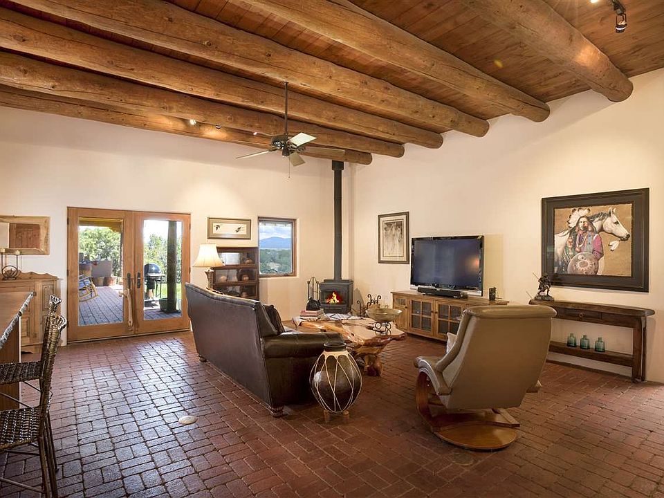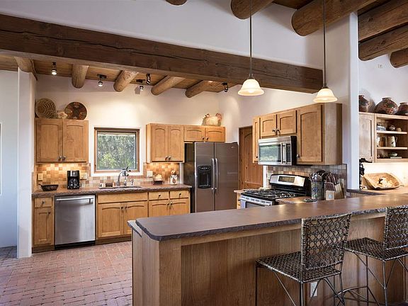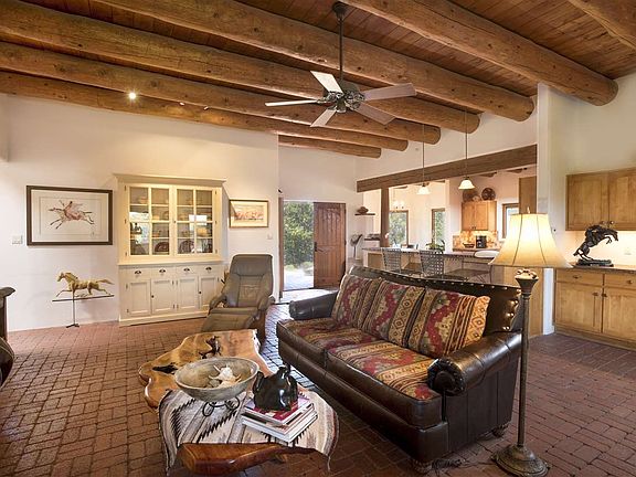 Custom, single level home on 9.3 acres with stunning, interrupted views of the Sangre de Cristos and the Galisteo Basin. The great room features 12 foot ceilings with vigas, beams and corbels, a wood stove and glass doors out to the spacious back portal. The kitchen has beautiful light, Alderwood cabinetry, sandstone counters, stainless appliances and dining with mountain views. A generous portal, off of the living area, runs the length of two exterior walls and has a raised fireplace, a vented hood for grilling and breath-taking views. The Master Suite has a kiva fireplace, a lovely bath with travertine tile, spacious closets and glass doors to the patio and views. Two additional bedrooms are graced with high beamed ceilings. The entire home has tumbled brick floors, Spanish Pueblo doors and Pella Designer Series windows with blinds. An additional 1113 square feet of heated space is in the heated, insulated and finished 3 car garage. This finished garage has 6 skylights and 3 windows, radiant heat, three 220 receptacles and is a perfect spot for a studio, workshop, or extra living space. A great well produces 25+ gallons per minute. Enjoy the peace and quiet, the starry nights and the mountain vistas from this charming home nestled among the pinons in beautiful Silver Hills. Great hiking and horseback riding trails too!