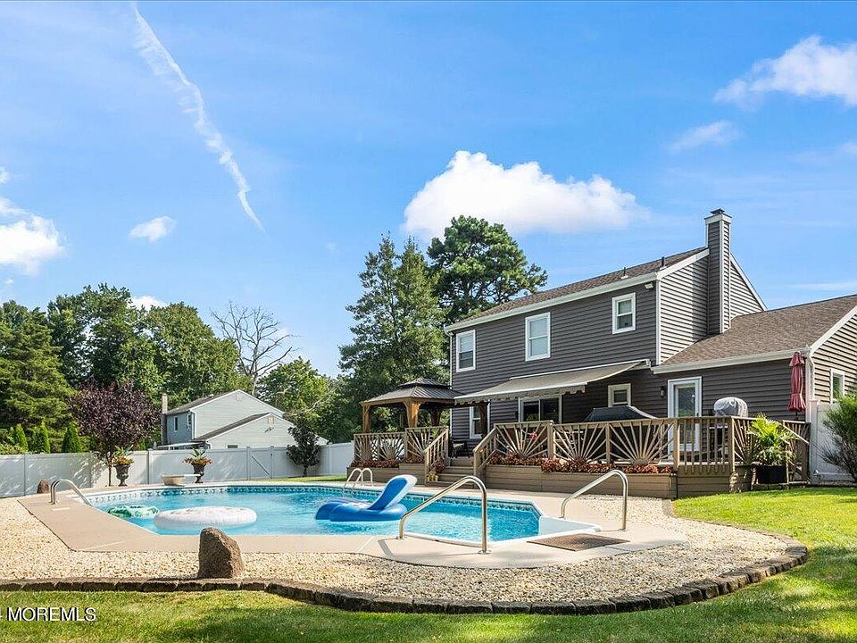 Meticulous Well Kept colonial in desirable Bayville awaits you. This home boasts 3 bedroom 2 baths and a FINISHED basement. Kitchen has granite counters,Stainless steel appliances & has a sliding door that invites you into the beautifully kept oversized backyard. Escape with an XL 42 X 19 in ground heated saltwater pool, large deck & electrical awning for all your entertaining. You will feel like you are away in this private yard with new vinyl fencing. Featuring: NEW ROOF with gable vents & automatic fan. NEW Anderson Windows & Doors, 6-zone inground sprinkler system running on a Newly installed well pump & new Cedar Impression Siding. 2-zone, 2-stage central air conditioning. Newer hot water tank with automatic water shutoff valve.Close to beaches. Minutes to GSP & shopping.