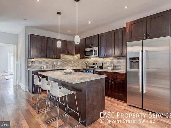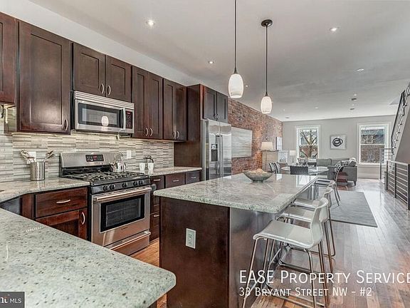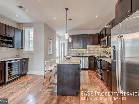 Stunning two-level penthouse condo in Bloomingdale w/ off-street parking and a private roof terrace! Welcome to 33 Bryant Street NW. Spanning over 1,600 square feet across the top two floors of a two-unit rowhome, you'll love the thoughtful updates that went into this three bed, three bath home. Home Features: Occupies the entire top two floors of a two-unit converted rowhome Beautiful hardwood flooring and exposed brick throughout Main living area is wide open and filled with natural light Plenty of space for a large dining table High-end kitchen with stainless steel appliances, granite countertops and large island w/ bar seating Separate wet bar area off of kitchen First bedroom at back of main level with a private deck Full bathroom in hallway Upper level leads to the spacious primary bedroom with coffered ceiling and walk-in closet Ensuite primary bathroom features a dual vanity Third bedroom at back of upper level has custom built-ins throughout and an ensuite bathroom Private rooftop deck w/ grill rounds off the home, perfect for entertaining your guests! Washer/Dryer in unit Parking: One off-street parking space w/ roll-up garage door included in rent. Utilities: Tenants are responsible for gas and electric. Water is included in rent. Lease Terms: Available June 1, potentially a little earlier if need be. Minimum 12 month lease. Application fee is $35 and includes a credit check. Security deposit equal to one month's rent due upon lease signing. Pets considered on a case-by-case basis pending approval by Owner. Location: Bloomingdale is known for its beautiful Victorian-era rowhomes and quiet, tree-lined streets. Walk to both the Park at LeDroit and the "hidden" Crispus Attucks park. One block away from the brand new Reservoir Park Recreation Center including an indoor pool and fitness center. Just a few blocks away from great restaurants/bars like the Red Hen, Boundary Stone, Bacio Pizzeria, Sylvan Cafe, Etabli and more. Very easy access to N. Capitol St makes commuting to Capitol Hill a breeze as well, or you can walk to the Shaw Metro Station.