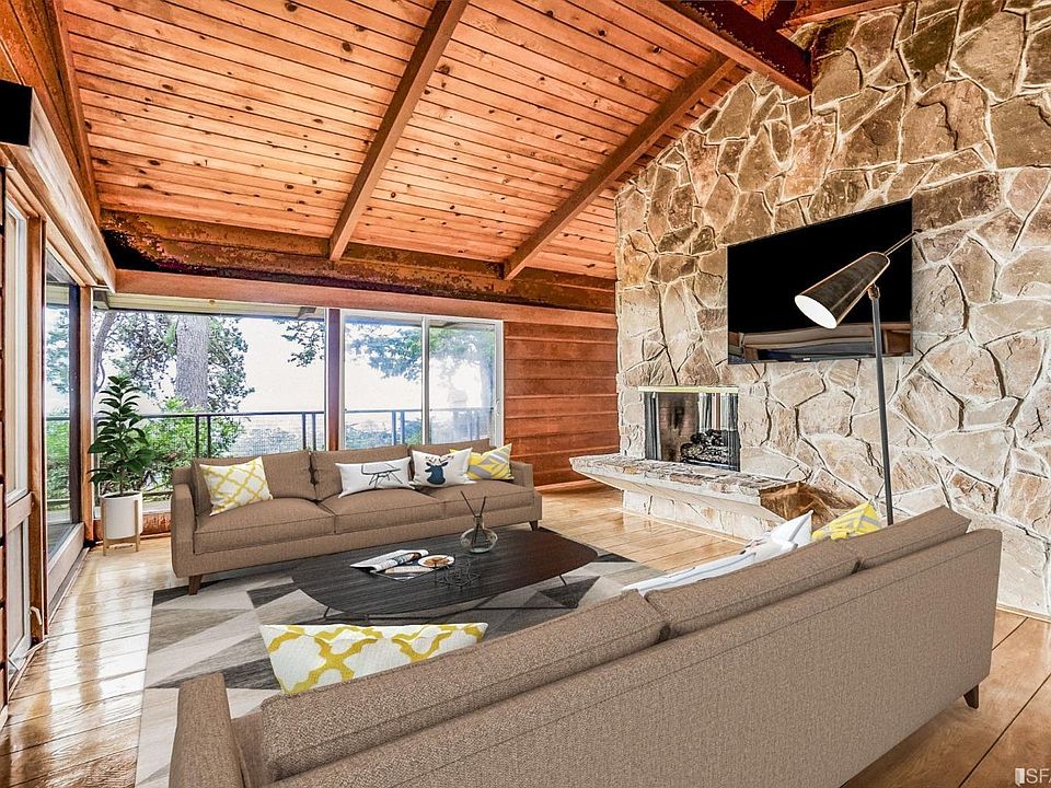 Rare vintage 2BD/2.5BA Piedmont Pines Mid-Century with panoramic views of the Bay, San Francisco and two bridges PLUS a large unfinished lower floor ready for possible expansion! 33 Castle Park Way greet visitors w/a bright FLR w/a FP and views, a FDR w/FP and views, a bonus family room w/FP & wet bar that adjoins the galley kitchen, and a big West-facing wrap-around view-deck that ties it all together. A spacious Primary Suite, 2nd ample BD, 2nd full BA w/laundry, and a 2-car garage, completes this main living level. Downstairs is a large unfinished basement w/high ceilings, plumbing for a possible BA addition, AND sliding doors to a 2nd deck, all ready for possible home expansion within the envelope of the home. Lower floor Matterport drawings show 700+ Sq Ft, which is likely not included on the public tax records (Buyers to verify). Warm wood floors, lots of Mid-Century period charm & abundant reconfiguration options run thru-out this unique offering. Wonderful serene location with a 12,000+ Sq Ft lot (per Tax Records) that abuts Joaquin Miller Park hiking trails at the rear AND is conveniently located just minutes from Montclair, local schools, area shopping, dining & coffee AND EZ commute access via Highway 13, 580 & 24. Cash or hard money only due to condition of rear deck.