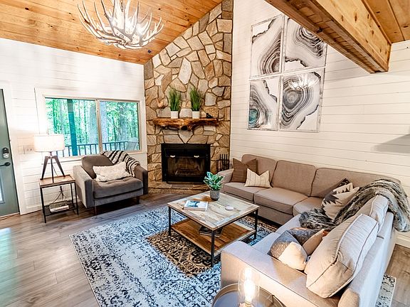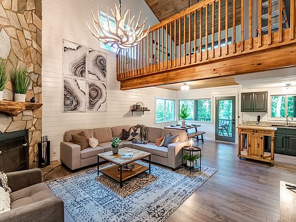 Fantastic mountain get away nestled in the Blue Ridge Mountains away from the hustle and bustle, but close to all that Blue Ridge has to offer. The expansive front deck is the perfect place to unwind and listen to the birds and other wildlife while sipping the beverage of your choice. The interior of the cabin is gorgeous with shiplap accents and a light white color palette making this home cozy and comfortable for you and your guests. The kitchen is well equipped with everything the chef needs and the adjacent dining area overlooks the woodback yard and there is access to another covered back deck for al fresco dining. Two bedrooms on the main level including one with an ensuite bath provide room for everyone and the upstairs loft can be used as the third sleeping area providing plenty of room for guests. The updated bathrooms are just beautiful with top of the line materials and design! You will enjoy spending a lot of time making S'mores or just relaxing by the firepit. This property is as tranquil and relaxing as it gets! Currently being used as an STR with profitable income but also a great second home, this home is a plug-n-play opportunity for the savvy investor!