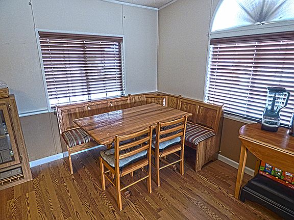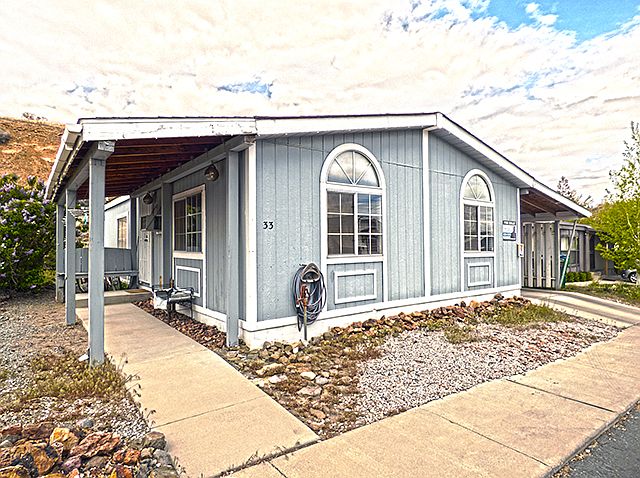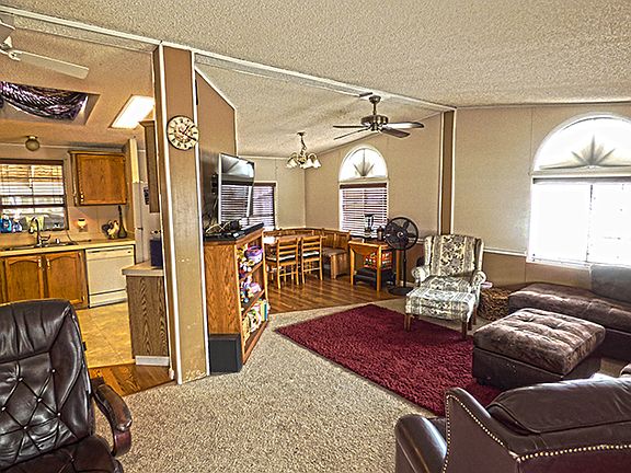 Open floor plan. Kitchen has lots of room. There's a combination of laminate wood flooring, linoleum and new carpet. The kitchen comes with all major appliances including laundry room with washer & dryer. The two bedrooms are spacious and the large master has a private bath with a garden tub. Two skylights and 4 ceiling fans.Roof covered carport, porch and patio. There's a small yard with fruit trees; parking for two and no rear neighbors. Must see!Lot Rent: 679/mo | Includes: Sewer