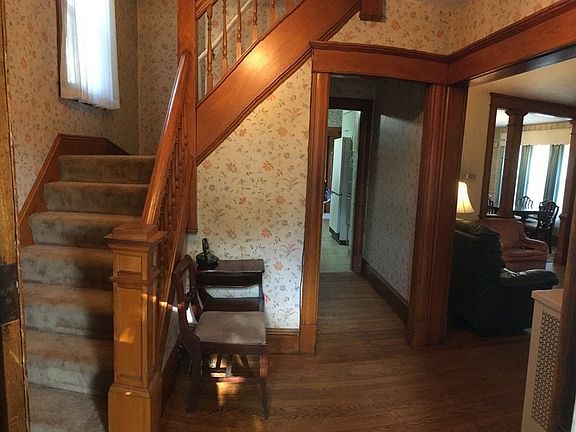Large Colonial Style home, Offers 3 bedroom + office/den/nursery. Gorgeous Natural Woodwork and Wood floors offered throughout the home. Enclosed front porch is very inviting. Front foyer welcomes you as you enter Large living room with fireplace and plenty of light. Formal dining room with built in china cabinet. The kitchen offers plenty of cabinets and counter space plus good size breakfast nook. Mud room With large coat closet off kitchen for convenience. 1/2 bath on first Flr. Upstairs offers 3 nice size bedrooms plus office/den. Full bath and good size linen closet in hallway. Walk up attic with plenty of storage. Finished basement with a nice family room/game room so many other options for use. Separate laundry area and nice work area. Replacement windows. Large 2 car detached garage, plenty of parking and storage. Very private sweet yard. All appliances to remain, Some furniture in the house may be left for buyers enjoyment If interested.