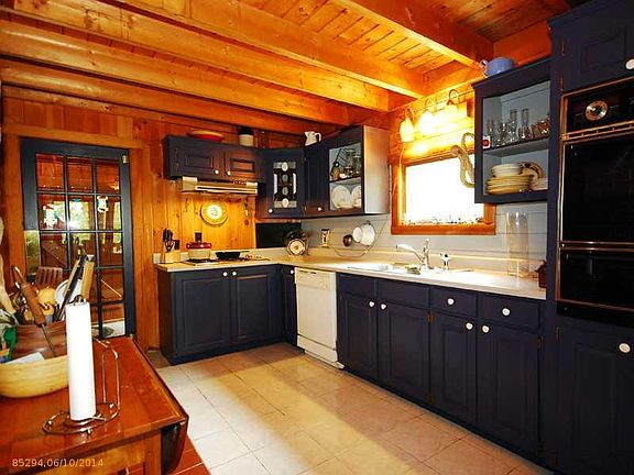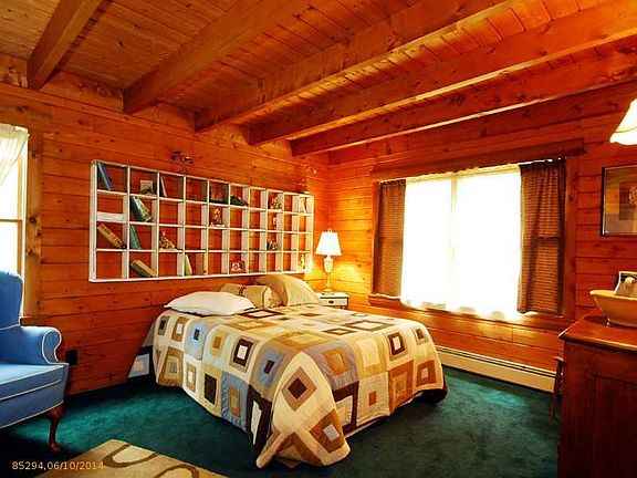 Completely private, beautiful log home, at the end of the road on 2 acres. Features amazing mountain views, cathedral ceilings, a two story fieldstone fireplace and two large porches. Little Sebago Lake boat launch just down the road! This home has a huge master bedroom with open master bath that features a claw foot tub and separate shower. Catwalk to loft and full walkout daylight basement for all your toys.