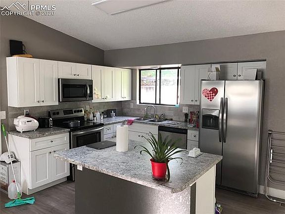 This beautifully remodeled home has 3 bedrooms,1 bath,1 car over sized garage & a huge shed. Very bright with high ceilings & LOTS of windows. Full of high quality upgrades & craftsmanship. Modern white kitchen cabinets, tile back splash & stainless steel appliances. Gray tone flooring throughout main level. Bathroom is beautifully remodeled. Just minutes from Ft. Carson this home provides beautiful mountain views with the luxury of cul de sac living and a quiet neighborhood. Available 6/8.