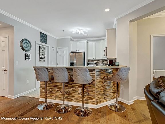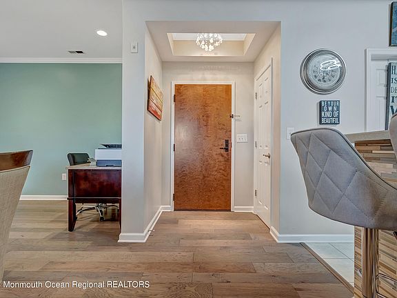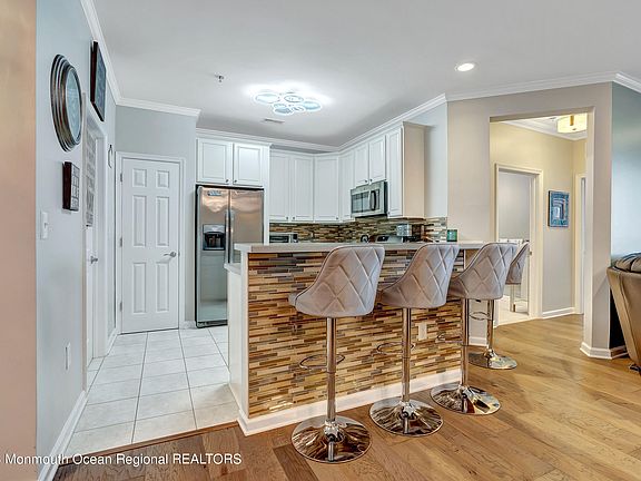 Ready for summers at the beach and Resort living all year long? This gleaming, updated Brighton model with western exposures, shows bright and sunny all day long! Open floorplan, high ceilings and newer beautiful wood floors. Inviting updated white kitchen, SS appliances and glass tile backsplash which is carried onto the front of the breakfast bar. Crown molding throughout, primary en-suite with sitting area and large bathroom w double sink, jacuzzi tub, stall shower and separate linen and water closet. The primary closet was closed off to offer a third sleeping quarters, den or office. The 2nd bedroom is on the other side of the condo with a full bath. Lastly there is a deck for summer dining, drinking and sunbathing! Grand resorts is just that, offering the beach and boardwalk right outside your door. A clubhouse with a phenomenal gym, new flooring and changing rooms with bathroom. There is a great room with fireplace and kitchen, which can be used for parties and special occasions. Outdoor heated pool with jacuzzi, all new chaises and tables with umbrellas to enjoy all day at the pool! Lovely, kind, friendly and warm people to count on here as well as an on staff management company. Walk to Ocean Place next door for a drink at the Tiki bar with live music, or a massage at their spa! Pier Village is a five minute walk to an ever expanding village of great restaurants, shopping, ice cream, treats, outdoor bar, carousel, weekly outdoor concerts and more! The new boardwalk is a 2 miles stretch each way with the ocean and beach views every step of the way. Grand Resorts is situated between many beach towns with tons of shopping, activities, bars and dining. One hour from Northern Jersey, 1 1/2 from NYC and we are a 7 minute drive to the NY train and 20 minutes to the luxury ferry Seastreak, Atlantic Highlands with food and bar. Come take a look you'll fall in love like I did 8 years ago and every year keeps getting better and better! Come let me show you what you were missing! We all need a new Happy Place, this could be yours!