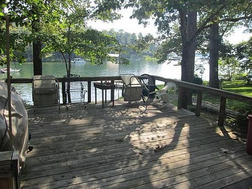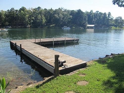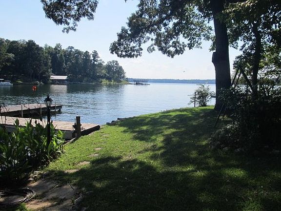 nice cabin on a great lot,174 feet waterfront, 3 bed/ 1 bath,kitchen,den fireplace, decks,pier, metal roof,flat to sloping, big yard, storage sheds carport, wood paneling tile and wood floors.