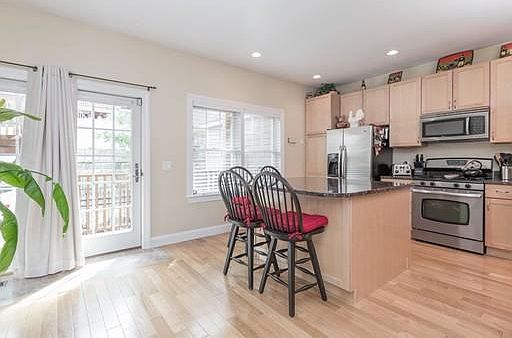 Rarely available townhouse-style duplex in the heart of Jeffries Point, steps from Piers Park, Maverick Station and the desirable East Boston Waterfront. Around the corner from MassPort's Maverick Street Gate which gives East Boston residents direct access to the MassPike. Ground-up construction in 2007, this contemporary home features 2 levels of living space, crown molding throughout, and custom wainscoting in dining area. Open concept kitchen/dining is ideal for entertaining, with french doors that lead out to 1 of 2 private outdoor spaces. Modern kitchen displays granite counter tops, stainless appliances, and custom island with seating for 4 as well as ample storage below. High end finishes throughout, including solid oak flooring, marble tile in bathrooms and entryways, as well as granite vanity tops. Boasting 1400 sq. ft of spacious living, 1 deeded parking space, gas cooking, central a/c, abundant storage throughout, what more could you ask for!