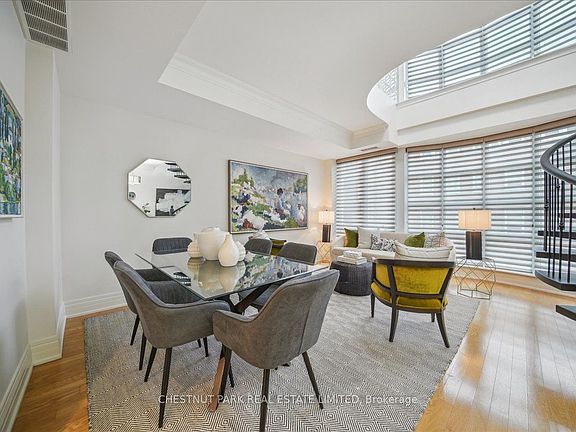 Unbelievable value! Luxurious, rare, 2-storey 1-bedroom plus den in a distinguished boutique building. Midtown, Yonge and St. Clair, parking and locker. Incredible opportunity, dramatic and refined, this unique two-storey residence features 18 feet of floor-to-ceiling windows flooding the space with natural light. A sweeping circular staircase and gleaming hardwood floors set the tone for elegant urban living. The living room boasts 10 feet ceilings while the kitchen is equipped with granite counters, a full-size refrigerator, and a brand-new Bosch oven. Finishing off the main floor is a spacious powder room. An impressive primary bedroom offers a spa inspired ensuite with a deep tub and two closets-one walk-in, both with custom-fitted California closets. A built-in bookcase anchors the perfect work-at-home den. The suite has been freshly painted throughout and has automatic blinds for effortless comfort. Enjoy full-service 24-hour concierge and porter service, indoor pool, serene landscaped courtyard, inviting party room, and gym. `The building's impressive limestone facade and grand circular drive add timeless curb appeal. Cable TV and internet are included in maintenance, and there's a convenient secondary suite entrance /exit from the 3rd floor. Pet-friendly, one dog (under 75 lbs.) or two cats permitted.