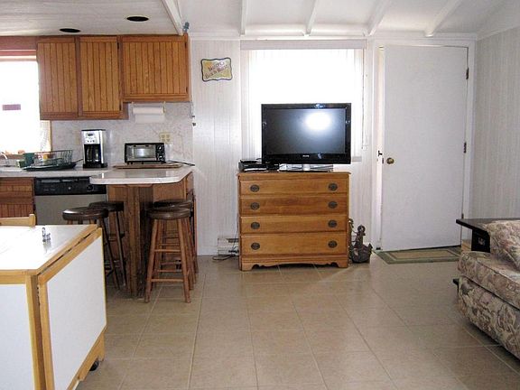 Ocean-block home with an open floor plan, larger bathroom, central air and heat, washer/dryer, dishwasher, ceramic tile floors, patio and vinyl siding. On owned land!