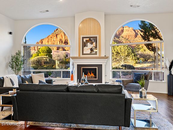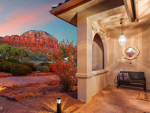 This one has it all! Views! Views! And MORE VIEWS! 3 Bedroom, 2 bath 2196 square foot home on over 1/3 of an acre located in the Chapel Area of Sedona close to an Iconic Sedona destination, hiking trails, with a fenced and walled backyard with tidal wave pool, outdoor shower, dry sauna, and hot tub! A resort in your own backyard! Endless rental possibilities! Interior offers a split floorplan with living room boasting a center floor to ceiling fireplace accented between windows with outstanding views complimented by wood floors through main living area. Formal dining room area, kitchen with bar height counters offers loads of cabinets, newer cooktop, granite counters and a sweet breakfast nook with desk area. Split floorplan offers a primary bedroom ensuite with 2 walk in closets, dual sinks, a garden soaking tub and standalone shower. Primary Bedroom and Dining room open onto the covered backyard patio with views. Front 2nd Bedroom is complimented with built in cabinets and a window set with views and could easily be a home office. Back bedroom of course has a view too! Interior is finished with a laundry room with mud sink, 2 car garage with built in cabinets and extra refrigerator. Upgrades include solar system owned by the seller with an added tesla charging station, Rinnai tankless water heater offering instant Hot Water recirculation, replaced roof underlayment and interior recently painted. Back yard is a delight with raised garden beds, fruit trees, flagstone pathway with small patio, and of course an outdoor shower, 15-foot exercise pool with ozonator to decrease chlorine use, hot tub, and Infrared Dry Sauna! Who would ever want to leave! Whether its your primary, 2nd home or an investment home 33 Eagle Lane SOARS!