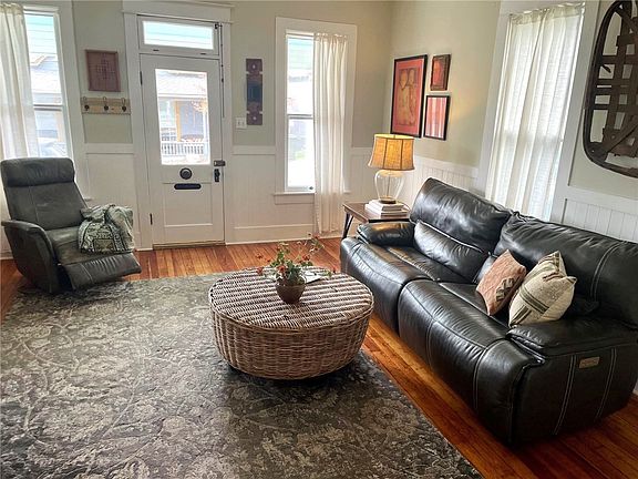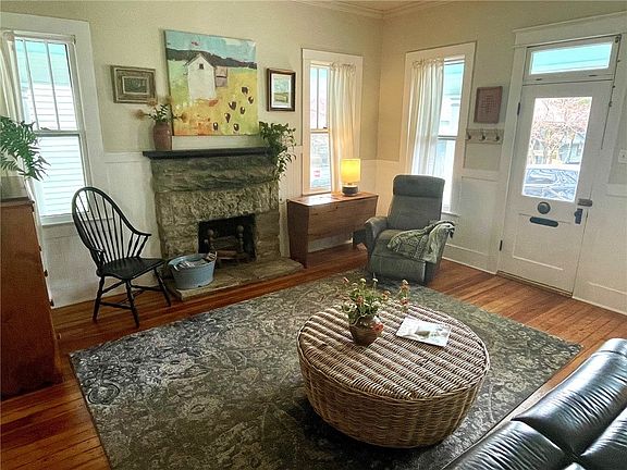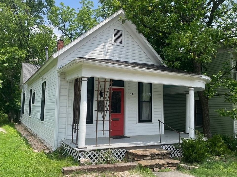 This charming cottage has been remodeled with the perfect blend of old and new. The wraparound front porch is a great spot to visit with neighbors. A vintage front door opens into the living room with heart pine floors and a limestone fireplace. A wide doorway with pocket doors separates the living room from the kitchen and dining areas. The kitchen has new appliances, a pressed tin backsplash and an island. The main bedroom and a guest bedroom are in the back of the house along with one and a half baths. The full bath has a modern clawfoot tub with a shower. You'll appreciate the closets and stacked washer and dryer. A sunroom stretches across the back of the home and a French door opens onto a composite deck. The back yard is fenced and there is an 8' x 14' outbuilding with electric service. All the rooms have 10-foot ceilings and original windows with new black storm windows. New composite wood back deck. Quick walk to your favorite Spring Street shopping and dining. Can not be a nightly rental.