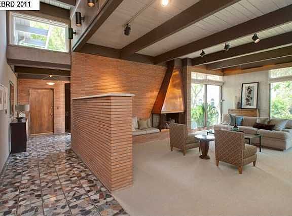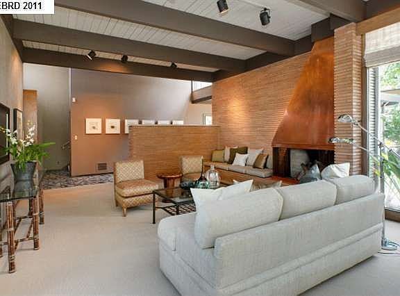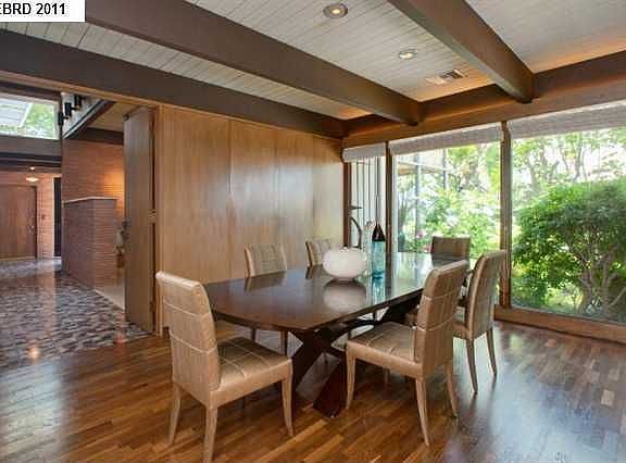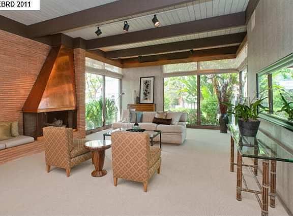 Sleek, sophisticated mid-century-style with distinctive architectural design-high beamed ceilings, custom stone and natural wood finishes, floor-to-ceiling windows. Convenient floor plan with large open rooms; family room off kitchen opens to large private patio.