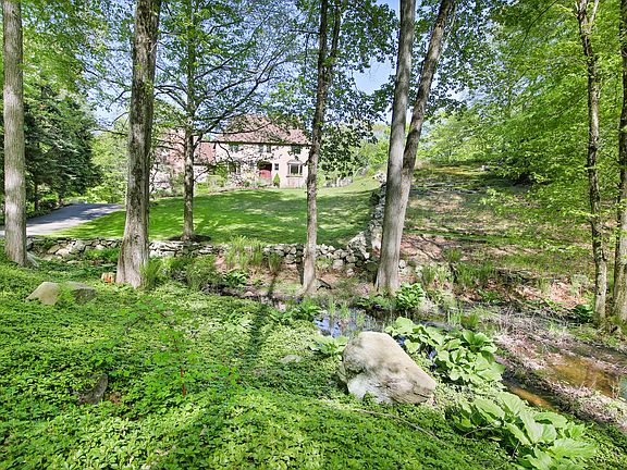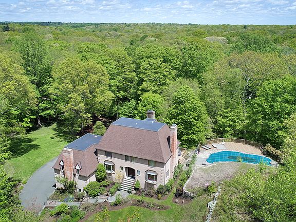 Magnificent high setting overlooking tall trees, vast woods, gentle stream, huge lawn. Very much a vacation home feeling, yet mid-Greenwich convenience. North Street/Central school district (Country Day School's newest campus opens soon at top of street). House features grand entrance, circular layout of living room, family room, kitchen with solarium, dining room, with multiple doors to deck and pool. Private library/office off kitchen plus bedroom and bath. Upstairs, large master suite with lux bath, two more bedrooms and bath. Gigantic garage and lower level, plus elevator for easy access! A truly quiet and serene setting.