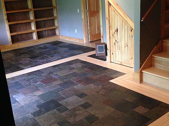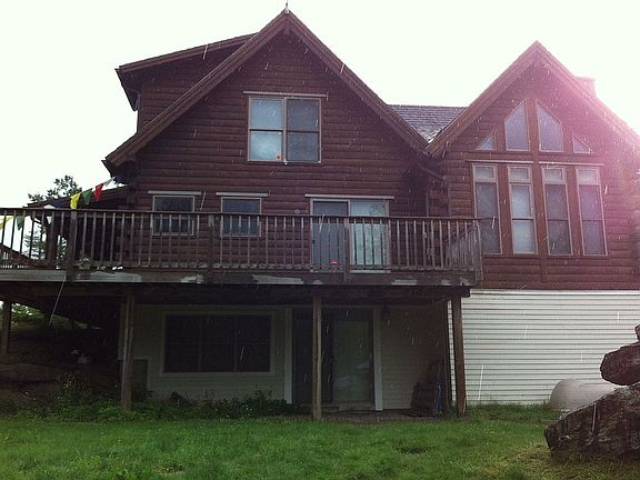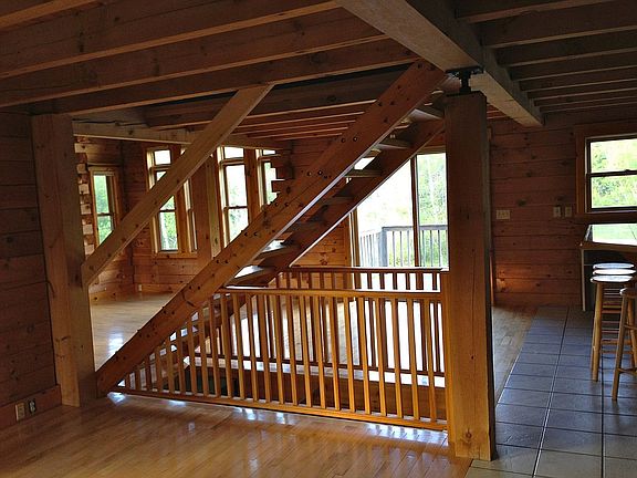 This log home has an open floor plan on the main floor, complete with cathedral ceiling in the step down living room, wood stove, granite tile in kitchen, full basement for private second quarters, and two rooms upstairs with unique tile bathroom. Features include modern flat logs on interior walls, walk-out basement, large vertical windows in living room and sliding glass door access to outdoor deck, with one of the best views of Mount Abraham in Lincoln. Don't forget radiant heat in both the basement and first floor. The large garage has two car doors, but also a large barn slider in the back for access to store yard machines such as lawn mowers and snowblowers. Open second floor offers lots of storage space.