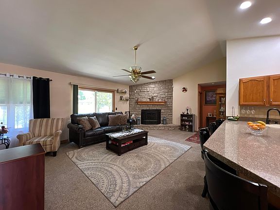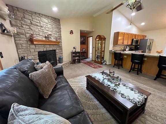 Step inside to find an airy open living area and kitchen adorned with vaulted ceilings, ideal for gatherings. A gas fireplace enhances the cozy atmosphere during colder months, while a patio off the living room extends the living space outdoors for summer relaxation.