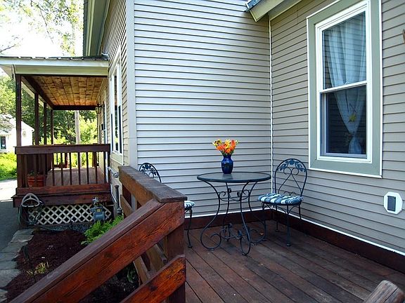 Located on a quiet side street close to town, this very sweet Cape was gutted, and completely renovated inside and out, in 2000. You'll love the low maintenance vinyl siding and metal roofing, and inviting wraparound covered porch. The interior offers bright, open common space; with beautiful natural wood cabinetry and space for both formal and casual dining. The living room runs the full width of the house for added light and air flow, and has easy access to the wraparound porch. The washer/dryer hookups are also conveniently located in the full 1st floor bath. The 2nd floor features two connecting bedrooms, a 3/4 bath and 3rd bedroom with access to great attic storage. The sweet yard features two beautiful dry stack stone wall planters, a small garden shed and a lovely apple tree just loaded with fruit every year. You love the convenience of this location, just minutes to Amherst, Northampton and Greenfield. You're home!