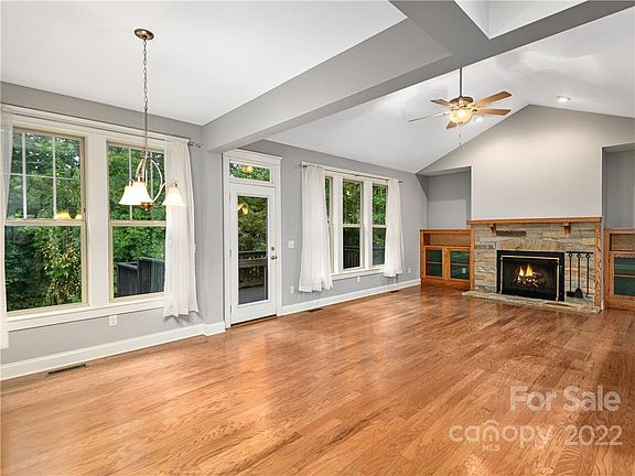 This Biltmore Lake home is the perfect mountain retreat. The all one level floor plan lives larger than the square footage suggests, offering large rooms, clean lines and an open and airy feel with vaulted ceilings and hardwood floors throughout, creating an easy, inviting space for entertaining. Experience the four seasons either cozied up by the fireplace, or out on the deck in the fresh air. The level, wooded half acre lot provides for a level driveway, as well as privacy and easy access to the miles of hiking trails in the community. When you're ready to get out and about, there's so much to do in the neighborhood: stop in the clubhouse to socialize with neighbors; take a boat out on the 68-acre lake or or play tennis, pickle-ball or basketball on the lakeside courts. Solar panels added for a lighter carbon footprint and higher efficiency.