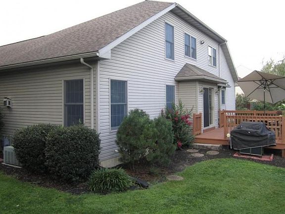 Make this lovely home your own! Welcoming 2-story tile entryway. First floor master with Jacuzzi bath. Open floor plan with 2-story family room + gas fireplace. Eat-in kitchen w/ light cherry cabinets and matching roll top, built-in desk. Private, spacious backyard with deck, recently re-finished. Full, professionally finished basement with bath + outdoor access. 23 x 15 storage area in lower level. Don't miss this one - it is sure to please!