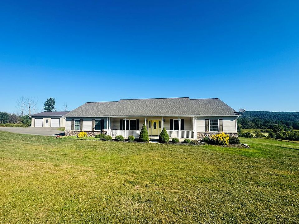 Endless Views, Endless Possibilities! This immaculate ranch home sits on over 12 acres with breathtaking 360 mountain views and is just minutes from PA State Game Lands #289. A paved driveway leads to a 2-bay pole barn—perfect for equipment, ATVs, or tractors—plus an attached 1-car garage with workshop and storage. Inside, you'll love the spacious kitchen with island and pantry, flowing seamlessly into the dining area, living room, and back deck for easy entertaining. The primary suite offers a bath and walk-in closets, while 2 additional bedrooms, a full bath, laundry room, and bonus room provide flexible living space—ideal for a 4th bedroom, office, a family room or formal dining. A full basement invites your vision for future expansion. With a whole-house generator and OGMs included, this property is not only move-in ready but full of potential. Come for the views, stay for the lifestyle!