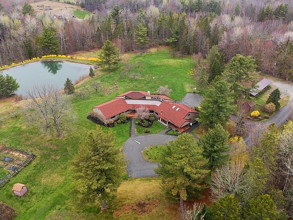 The thoughtfully designed landscape includes a large pond, a prolific vegetable garden, extensive perennial gardens, grapevines, berry bushes, and an orchard adorned with a variety of fruit and nut trees. A chicken coop and an additional 60'x40' barn makes this property uniquely set up for endless possibilities. A true homesteaders paradise! Inside the custom designed, solar oriented home you are welcomed by a grand living room with a dynamic, two-sided granite chimney servicing a wood burning fireplace and a coal burning stove with views overlooking Mount Katahdin on a clear day. With a total of 3800 square feet, this house does not disappoint. The striking kitchen with cathedral ceilings and granite counters leads you into the elegant dining area, blending traditional detail with a modern vibe. A parlor with unique cedar ceiling and stone flooring is home to a wet bar, a floor to ceiling stone water fountain feature and a cozy pellet stove. The primary bedroom has two walk-in closets and a beautiful en-suite with a tile steam shower. The 5 additional bedrooms all include amazing views and custom built-ins. you will also find an office/library space with a curved ladder leading to a loft perfect for a peaceful workspace or a fun and private hangout.