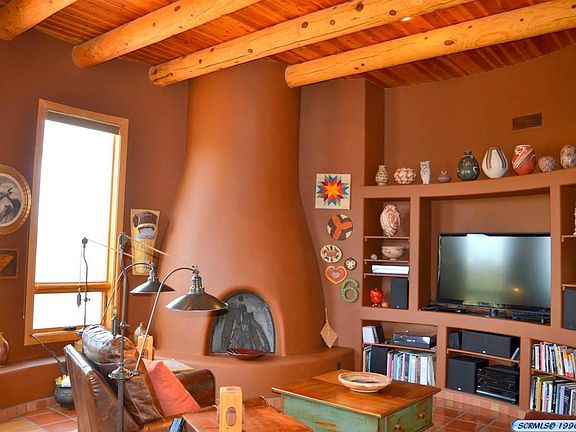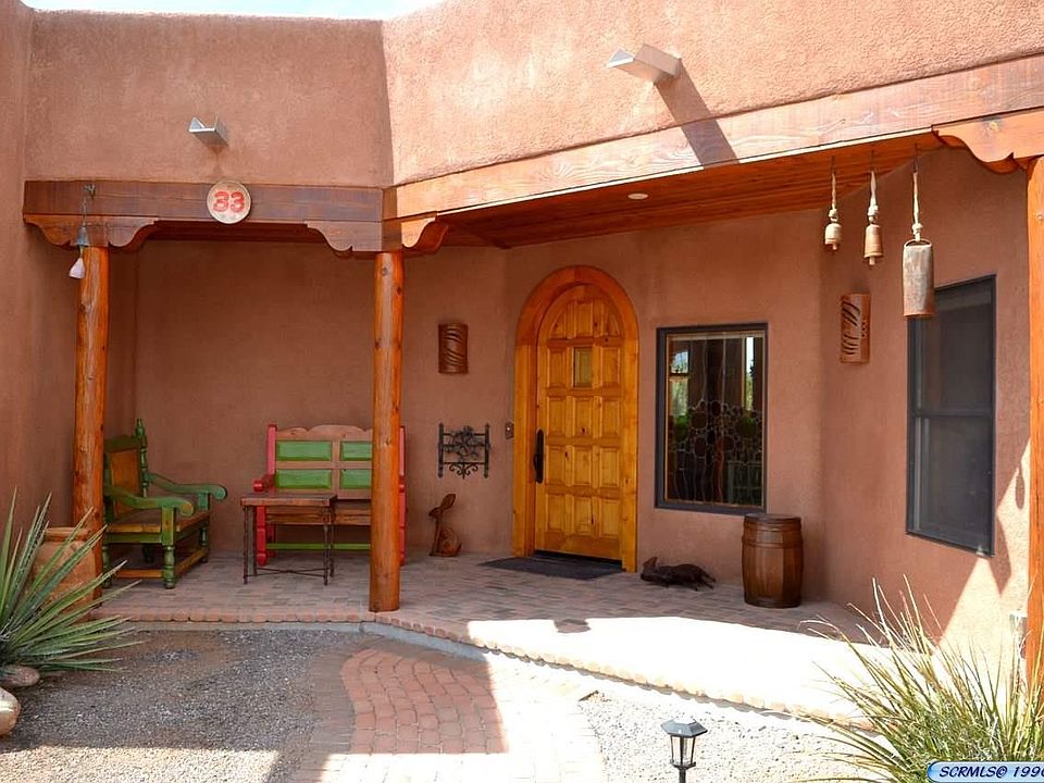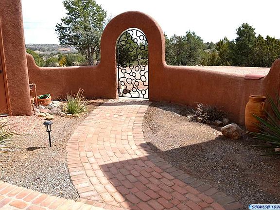 ONE-OF-A-KIND CUSTOM ARTISTRY 3BD/2.5BA on 3 lots (1.6 ACRES). Close to town with BREATHTAKING VIEWS of mountains and valley from front courtyard, covered back patio and EVERY room in the house. Circle drive leads to over-sized 3 CAR GARAGE including workshop area plus gas and 240 AMP electric for tools. Features include huge kiva style fireplace, large wood vigas, latilla posts and corbels. Many owner/artist designed details. Curved walls, solid wood doors, custom carved cabinets and copper sinks throughout. Great cook's kitchen with live-edge granite counter tops, stainless steel appliances and a walk-in, pantry with outlets. 2 x 6 construction with R38 insulation in ceilings, R22 in walls, rubber roof, reverse osmosis water system, 2 water heaters and softener and more. ALL CITY UTILITIES is a huge plus.