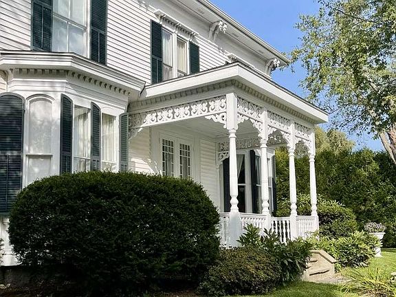 1879 Italianate in a charming waterfront town! The home has three bedrooms; one of which has ensuite and walk-in closet, two parlors, a dining room, office, eat-in kitchen with pantry closet. Plus a bonus room with window and shared closet that could be used as storage or another bedroom. Gorgeous doors and trim throughout. High 9.5' ceilings downstairs, and 8.5' upstairs, with lots of natural light. Large display cabinets in kitchen and dining room convey along with two office bookcases. Foyer has beautiful crafted solid oak staircase with brass newel post light. Original rare ornate radiators throughout the first floor. Easy access to attic with its own stairway. More features include a full, dry unfinished basement with concrete floor, and bulkhead; a two-bay garage; and raised bed vegetable garden. Nicely manicured wide lot with plenty of parking. Generous flowering trees and perennials. Extensive renovations and improvements have been completed including blown in insulation; electrical upgrade; zoned heating; new roof; garage doors; and fridge. A printout list of additional improvements by current owners is available. Walking distance to river and town landing, grocery, bakery, restaurants, post office and more. A real gem that must be seen!