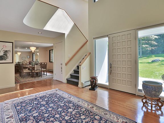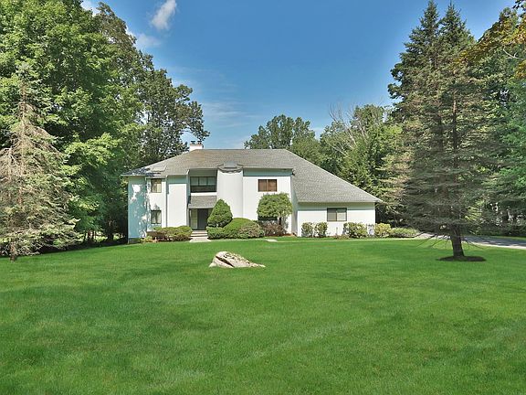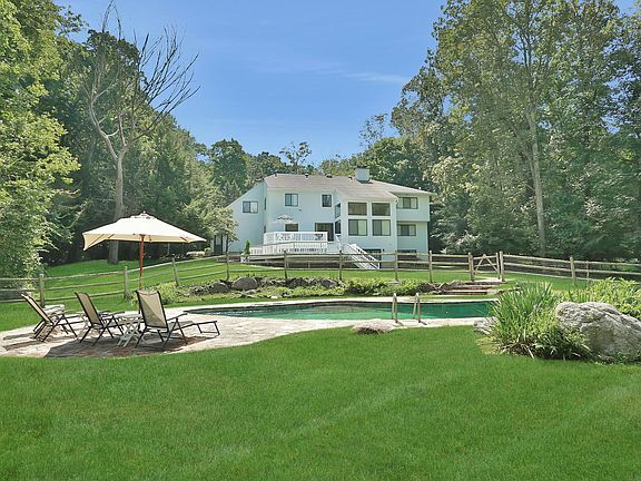 Perfectly sited on over two useable acres on cul-de-sac street in very quiet neighborhood with handsome view of house. Fenced in ground gunite pool. Recent upgrades for move right in condition. Updated kitchen with granite counter tops and an over abundance of cabinets. Finished 1000 sq ft, walk out lower level with full bath, wet bar, den/office/br and large family area/media room wired for surround sound. Kitchen & family rm open to large two tier entertainment deck. Cathedral ceilings throughout and oversized windows flood house with natural light and views from every room to spacious flat lawns. Japanese rice paper window in dining room opens to spectacular Japanese Pine.
