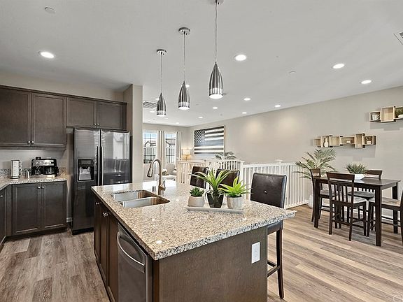 Welcome to luxury living at Esencia in Rancho Mission Viejo. This Sage Plan 2 townhome has a prime location within the community that offers plenty of natural light, HILL/MOUNTAIN/SUNSET VIEWS and has been tastefully upgraded with "wood" laminate flooring throughout the entire home, recessed lighting and ceiling fans in each room. Entering the home, you'll immediately find the private guest suite with attached bath, laundry room and direct access to your oversized 2-car garage with storage nook. Upstairs, you'll find the open concept living room, dining room and kitchen, guest bathroom and private master retreat. The chef's kitchen has plenty of counter space on its granite countertops and oversized island, upgraded stainless steel appliances, and its stylish gray cabinetry has lots of storage. The kitchen is open to the dining room that has access to your own balcony, perfect for BBQing, the half bath and your spacious and bright living room. The master bedroom has two closets and en-suite bath with dual vanities, quartz countertops and chic gray cabinets, tile flooring and large tiled shower with glass enclosure. HOA amenities include multiple pools & spas, parks, trails, dog park, coffee shop, garden, fitness center, arcade, neighborhood bar and much more and is mapped to TOP NOTCH SCHOOLS and easy access to the 241 Toll Road.