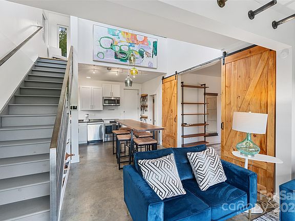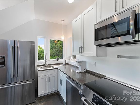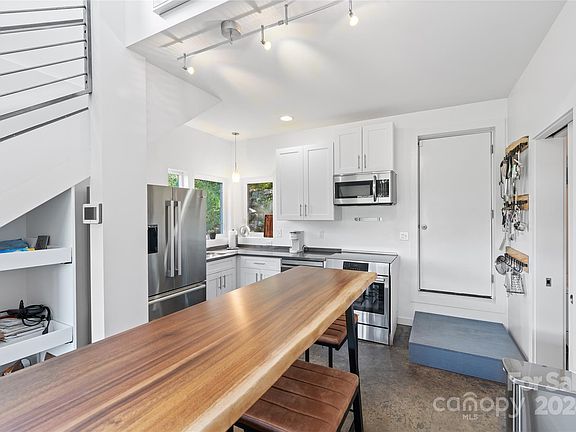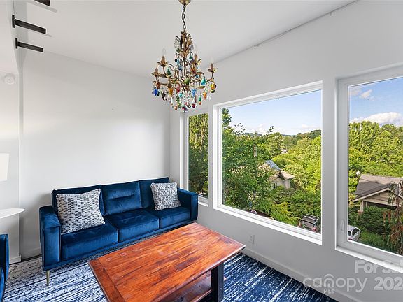 A light-filled contemporary refuge enhanced with custom artistic metal fixtures just steps from all cool things Asheville! Perched above the street & overlooking the downtown skyline there's a private feel to both this residence & this West End Clingman Ave neighborhood (WECAN). Clerestory entry breathes air and light to both the main & upper levels with a spectacular custom steel banister linking the two floors. Updated, open kitchen with radiant concrete floors on the main, newer appliances, new minisplits, Murphybed & updated bathrooms including jacuzzi tub. Original owner incorporated craftsman features throughout: steel-framed mirror, wood & steel shelving, concrete & steel bath vanity & more. Take in the views from front upper & lower decks or enjoy the privacy in the backyard patio under spectacular oak trees & next to the cascading waterfall and pond. Fantastic opportunity to walk to the RAD, Grey Eagle, greenway & more! Furnished too!