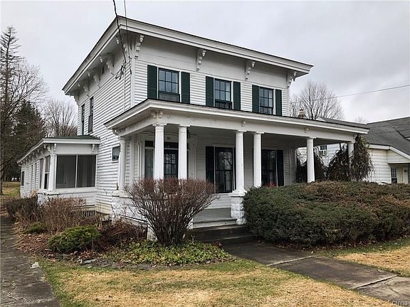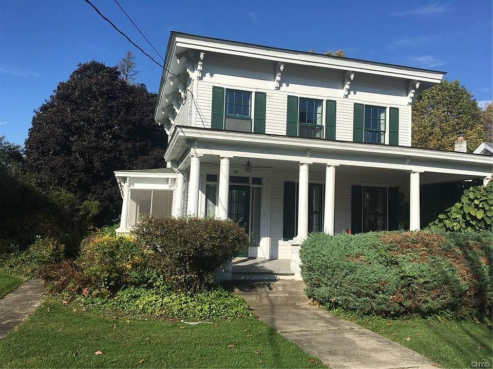 Central village location in Hamilton for this mid-19th century charming Italianate home. Formal LR set off by 2 prs. of French doors, cozy den/tv rm. w/woodburning fp, formal DR w/fp, 1st flr. BR & full bath, eat-in kitchen w/walk-in pantry, convenient 1st flr. laundry, 2 BRs + one full bath on second flr., (potential 3rd BR w/o closet), front & back stairs, open front porch, enclosed heated back porch, large barn/garage offers storage, very large yard for village. Many new windows, Buderus boiler, wood floors, lots of attractive period woodwork.