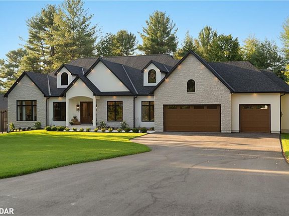 This breathtaking custom bungalow sits on a meticulously landscaped lot, surrounded by mature trees in one of Phelpston’s most sought-after estate communities. Offering over 5,700 sq. ft. of thoughtfully designed living space, including 3,200 sq. ft. on the main floor and an additional 2,565 sq. ft. in the fully finished basement. Every detail in this less-than-two-year-old home speaks to luxury and quality. From the Arriscraft stone and stucco exterior to the striking white Porcea stone entrance and custom black casement windows, the curb appeal is unmatched. Inside, soaring 10-foot ceilings, engineered white oak floors, and a cathedral great room with a 42” Napoleon Elevation fireplace set a sophisticated yet welcoming tone. The kitchen is a chef’s dream, featuring custom white oak cabinetry, quartz countertops, a 126-inch island, and premium appliances, including a 36” Fulgor Milano gas stove and a stand-alone fridge and freezer. Adjacent to the kitchen is a large walk-in pantry and a mudroom with custom storage solutions, ideal for keeping life organized. A main-floor office provides a quiet space for work or study, while three spacious bedrooms—each with its own ensuite and walk-in closet. Downstairs, the fully finished basement expands the living space with two additional bedrooms, large rec room featuring a stylish bar with a sink and fridge, and a home gym with a custom sauna for ultimate relaxation. Outside, a 600-square-foot covered porch with tongue-and-groove detailing invites you to unwind or entertain in style, while the automated irrigation system keeps the manicured yard lush and green. The heated 1240 square foot triple-bay garage with inside entry to the lower level, built-in lockers and drive-through access adds convenience to everyday living. Located near Snow Valley and Horseshoe Valley ski resorts and premier golf courses, this estate offers the perfect blend of luxury, space, and proximity to everything you need.