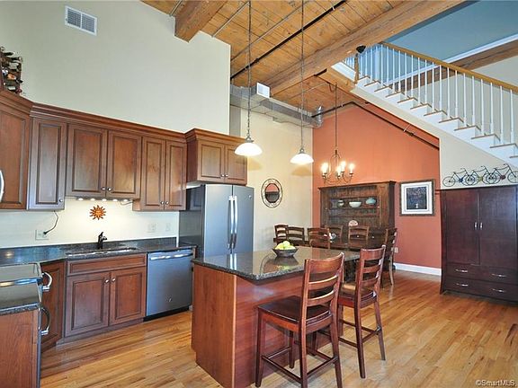 This spectacular unit will simply take your breath away Nestled in the Heart of Windsor Center, First Town Square is the place to live. This fine property offers a touch of elegance blended with the appeal of casual living. Stunning architectural features include massive wooden beams, exposed brick walls, large windows, an open staircase and balcony, volume ceilings and an intriguing spacious loft. The Kitchen boasts all the desirable amenities including granite counter tops, granite Island / breakfast bar, an abundance of maple cabinetry, hardwood floors and stainless steel appliances. The modern and open floor plan of the living room, dining room and kitchen makes this home perfect for those who love to entertain. The master bedroom features exposed brick walls and a full bath with a whirlpool tub. If you enjoy working out there is a private gym on site. Living in Windsor center offers the ultimate lifestyle for all ages. This beautiful residence is within walking distance to shopping, restaurants, library, banks, grocery store, parks, bus stop and train station. Imagine hopping on the train and spending the day in New York city. For those who love the outdoors , step out your front door and hike or bike the walking trails by the Farmington River. If you like to kayak or canoe there is a boat launch close by. Windsor center offers the appeal of a charming New England village and features an expansive town green where numerous activities are offered for all to enjoy