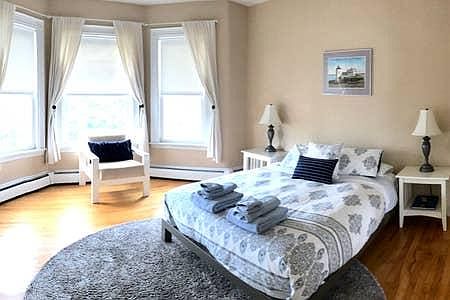 Bright (1250+ SF) two-bedroom third floor apartment, high ceilings in a quiet building boasting fabulous views of Casco Bay. Sunny, open kitchen, living room, dining room, spacious master bedroom, office and guest room with a terrific deck make this a great habitat on the "Hill." Dishwasher, washer/dryer, gas range, carpeted hallways, private landings and bedroom AC units. Less than a block from Eastern Promenade park and the Portland Trail system. Walking distance to terrific restaurants, produce markets, coffee shops, galleries and the Old Port. Off street parking rotation for one car and basement storage. 8 month lease. 9th month lease considered. Furnished at $2,400 plus utilities or $2,800 with Wi- Fi, power& gas heat/hot water. Unfurnished unit is not an option. Available October 15th. 6-7 month lease- furnished with utilities including Wi-Fi.