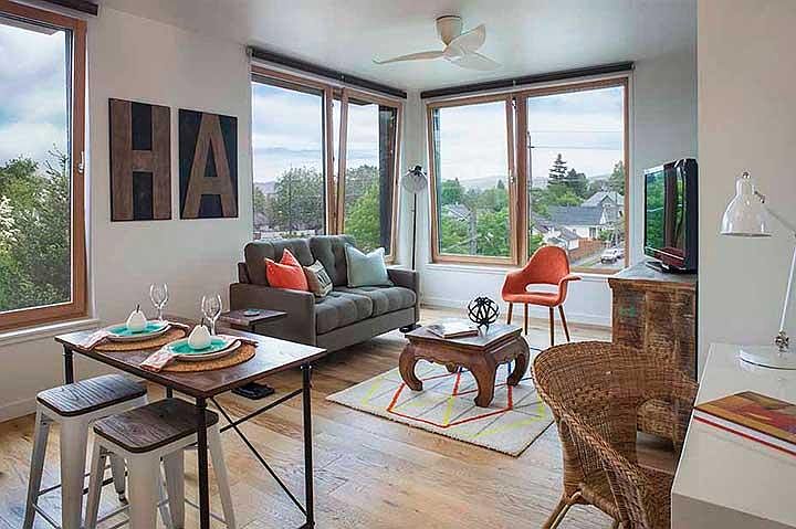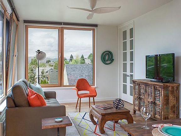 The entire length of this 1/1 has huge, south facing tilt-turn windows and oak flooring throughout the apt. The bathroom has washer and dryer, slate flooring, bath tub and a huge mirror. The kitchen has thick butcher block counters, stainless steel appliances and a detachable island that doubles as a drink cart or stand up desk that faces your awesome view of Downtown and the Fremont bridge. Hydronic wall heaters and passive cooling keeps the electrical bill always under $22 a month. Shared amenities include: a bike room with an air compressor, trash room so you never have to worry about taking out the bins to the curb and an outdoor patio just steps from your door with BBQ - and being in a small, 19 unit building you're almost always guaranteed to have it all to yourself! The building is pet friendly and walking distance to New Seasons and other great food options. Feel free to message me with any questions you have about this awesome apt!